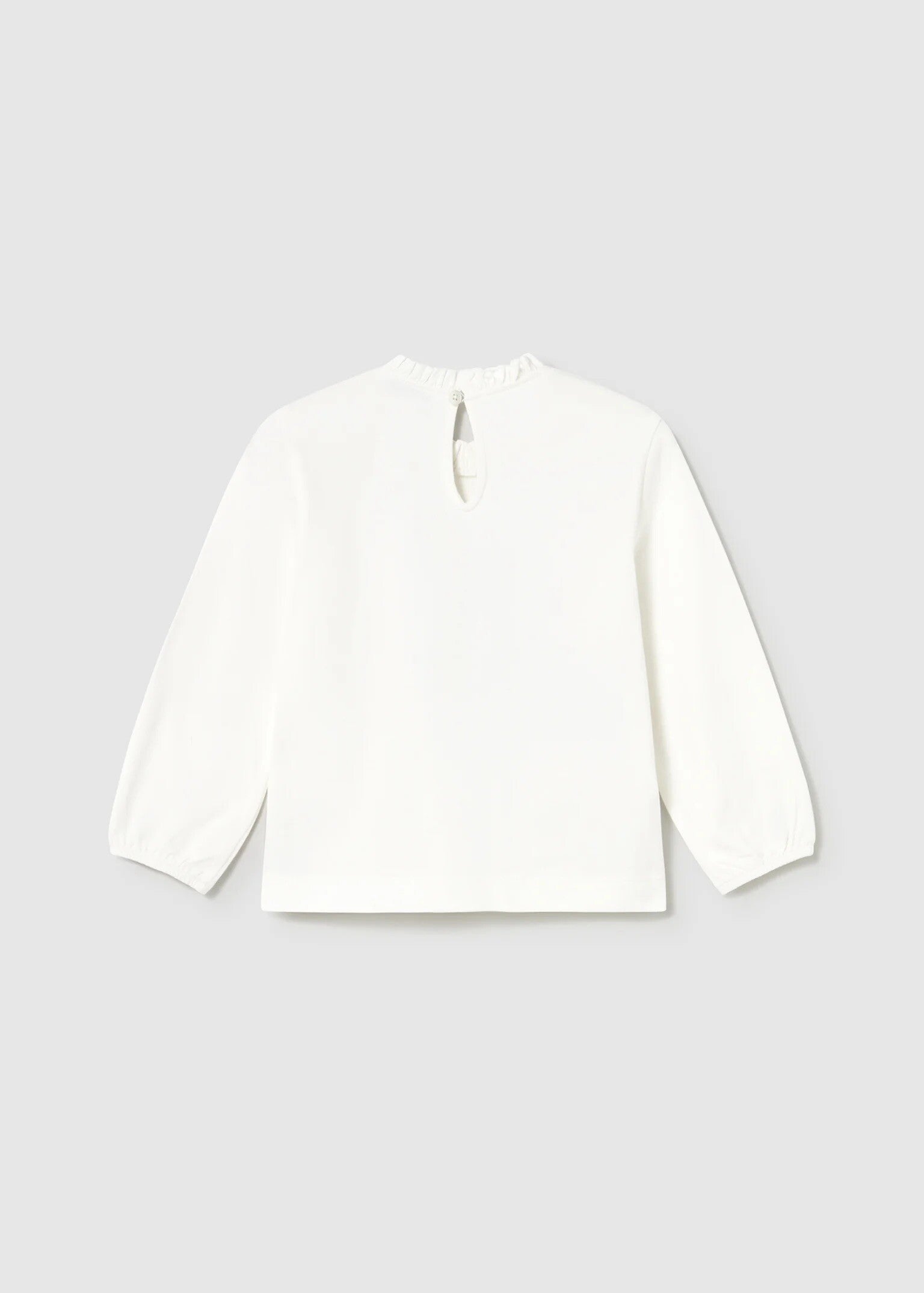 Maglietta a maniche lunghe, girocollo,con volant, chiusura con unico bottone. Pantalone corto,elastico regolabile in vita che garantisce migliore vestibilita.
